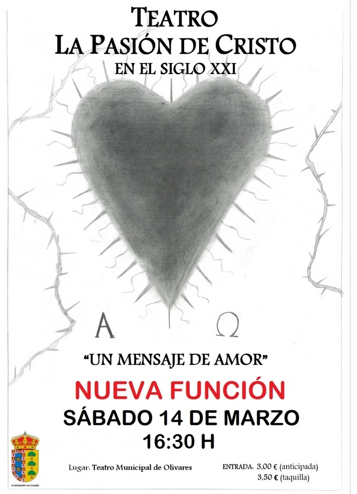 El día 14 de marzo a las 16:30 Y 18:00 horas y el día 15 de marzo a las 12:00 y 17:00 horas se representará en el Teatro Municipal de Olivares La Pasión de Cristo en el Siglo S.XXI "Un Mensaje de Amor", organizada por la Parroquia Ntra Sra de las Nieves de Olivares y patrocinada por el Ayuntamiento de Olivares.