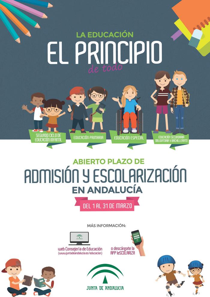 La Consejería de Educación de la Junta de Andalucía ha abierto el plazo de admisión del alumnado en los centros docentes públicos y privados concertados para cursar las enseñanzas de segundo ciclo de educación infantil, educación primaria, educación especial, educación secundaria obligatoria y bachillerato para el curso escolar 2018/19.