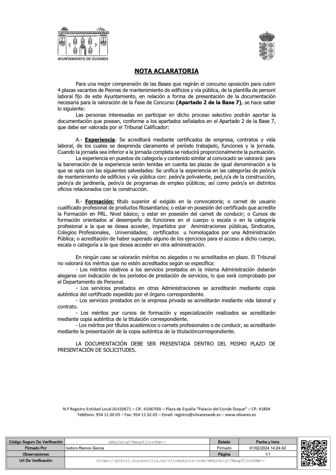 El Ayuntamiento de Olivares ha puesto en marcha una importante oferta de empleo público de personal laboral fijo en turno libre/estabilización consistente en cuatro plazas de peón de Mantenimiento de Edificios y Vías Públicas.