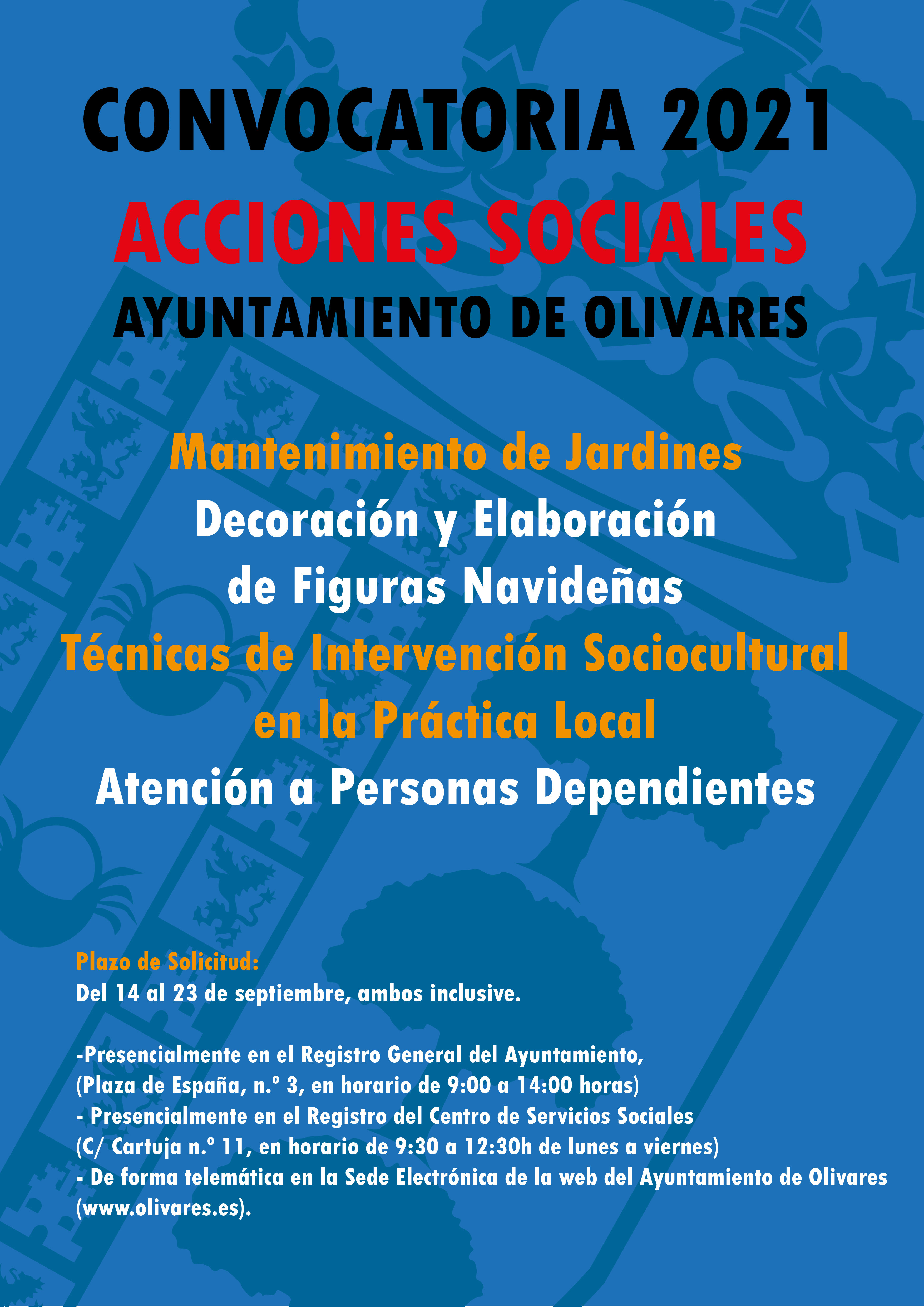 El Ayuntamiento de Olivares ha hecho público en el día de hoy, 14 de septiembre, las cuatro nuevas Acciones Sociales que se desarrollarán en el municipio durante los próximos meses. En base a la resolución número 744/2021, con fecha del 13/09/2021, se convocan las siguientes Acciones Sociales: