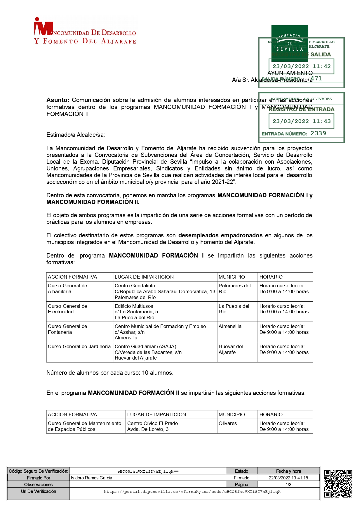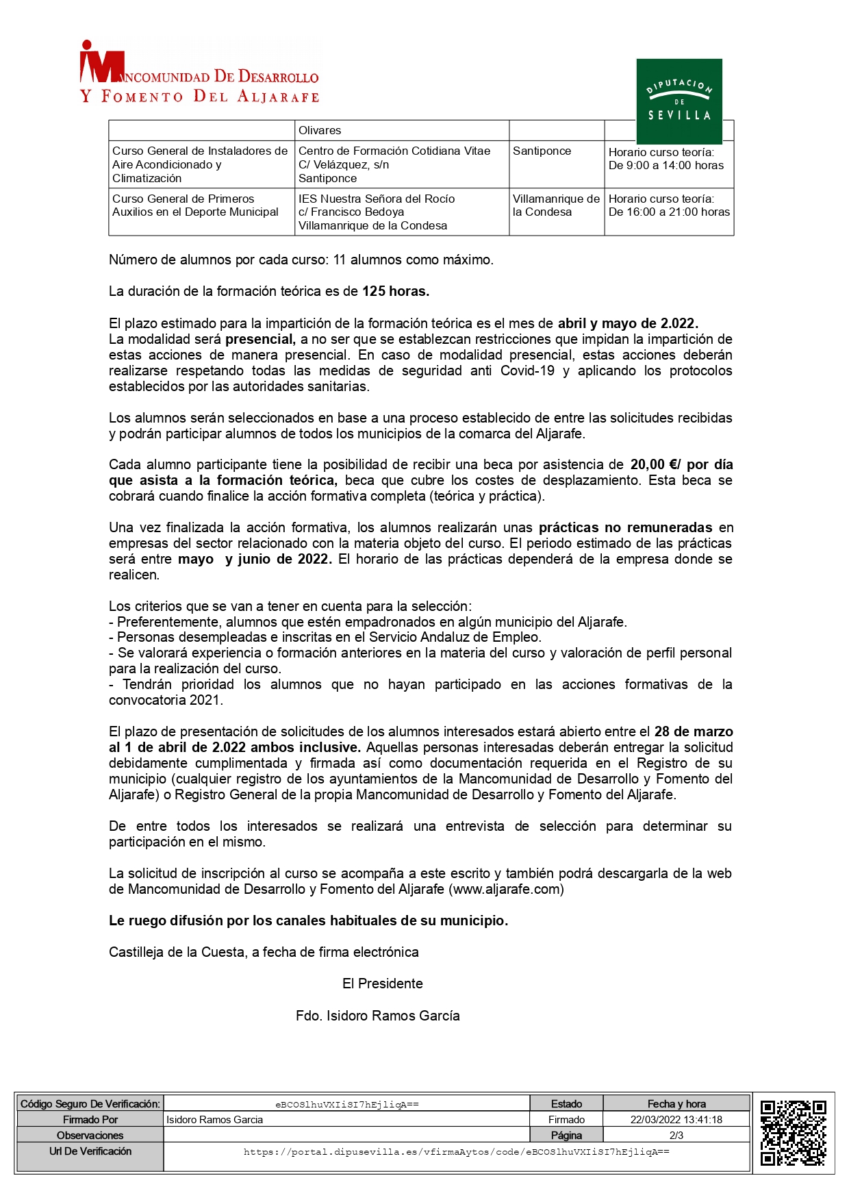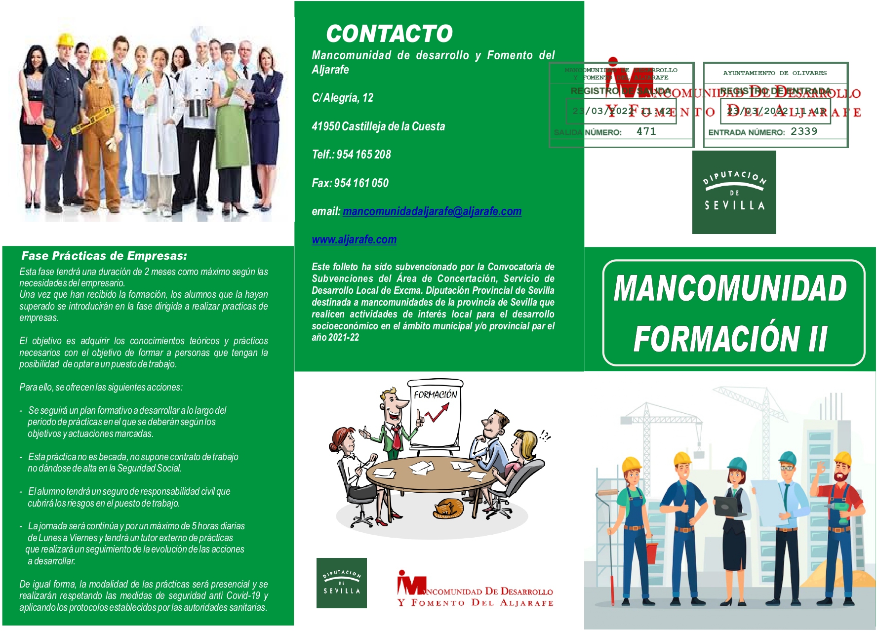La Mancomunidad de Desarrollo y Fomento del Aljarafe, de la que es Presidente el Alcalde de Olivares, Isidoro Ramos, pone en marcha con carácter inmediato dos Programas formativos con el objetivo de impartir acciones formativas con un período de prácticas para el alumnado en empresas.
