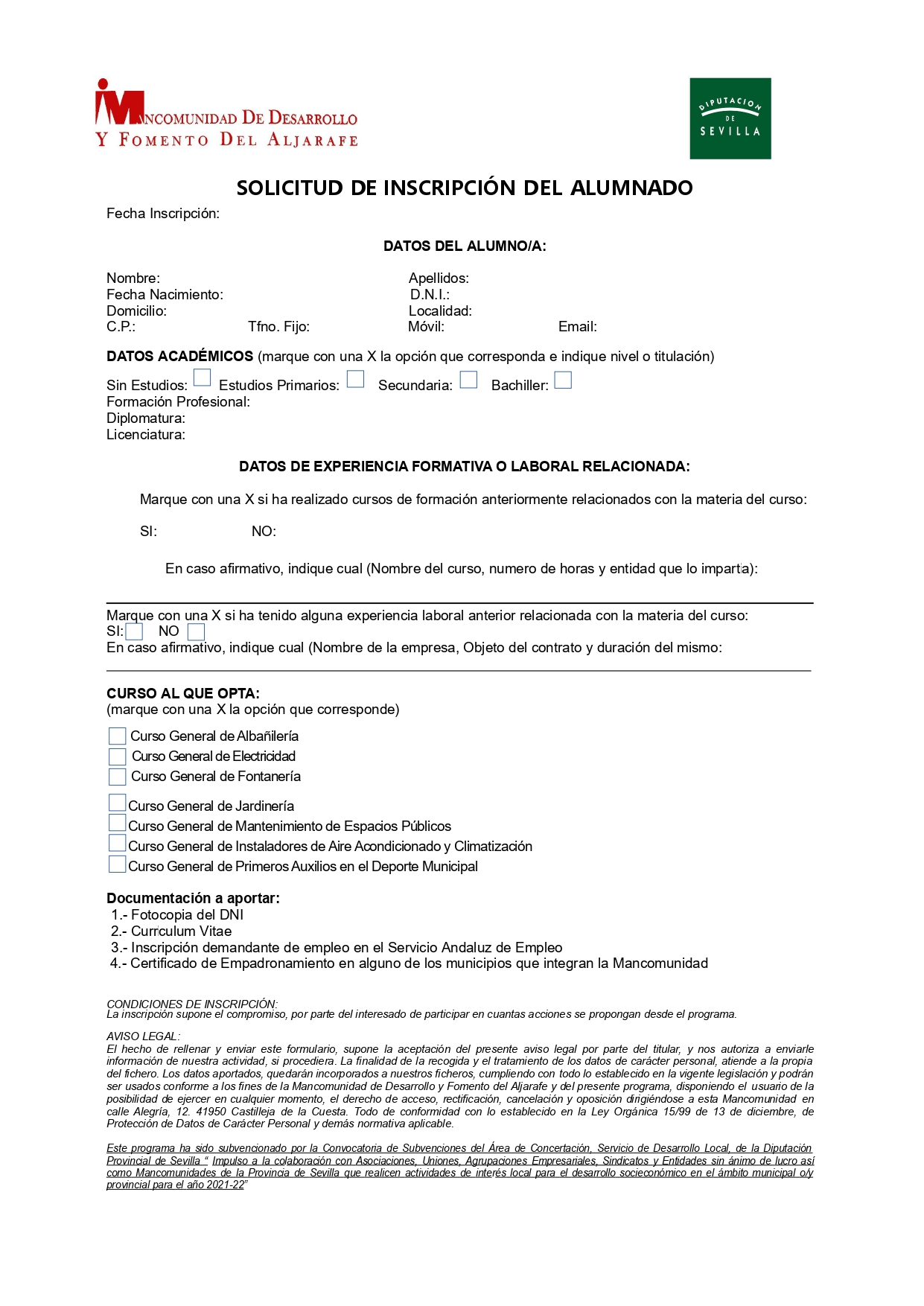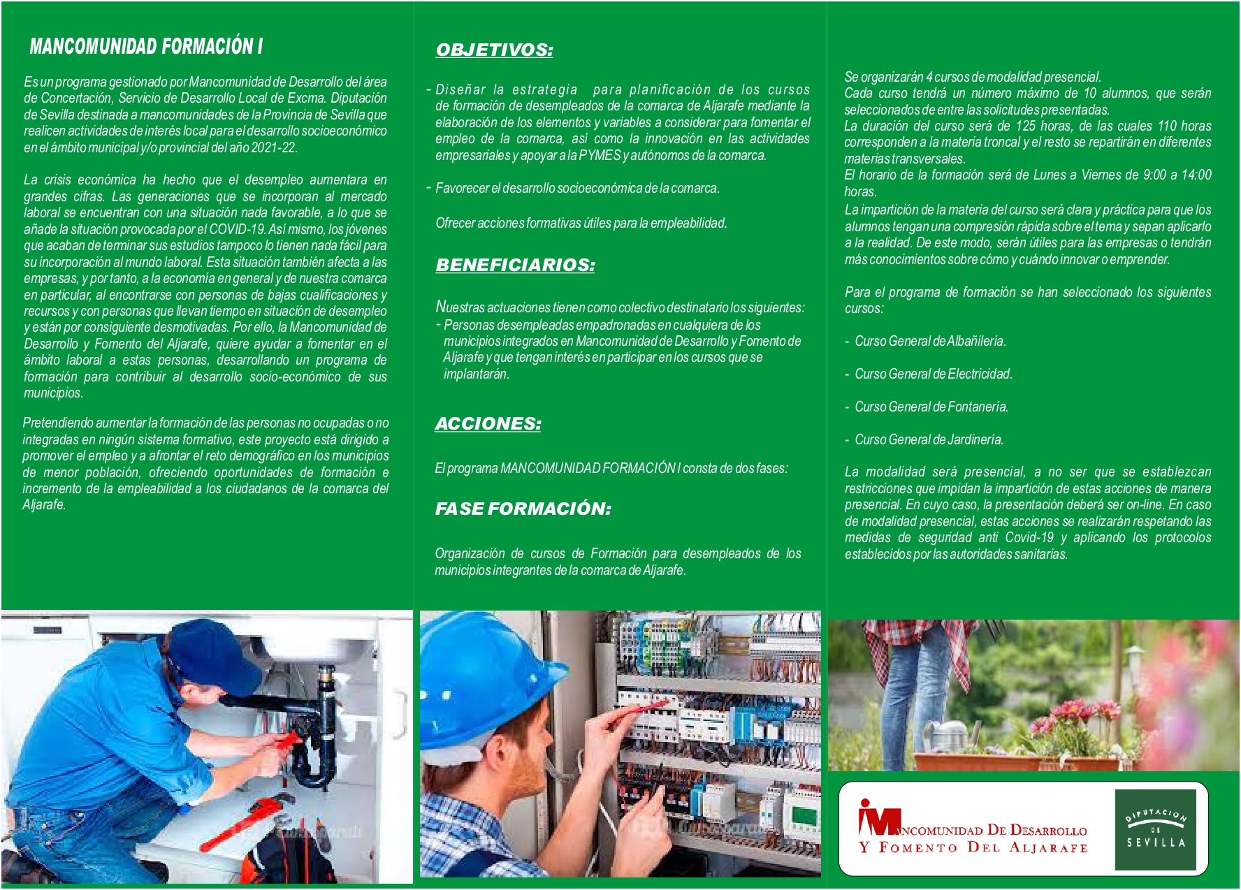 LA MANCOMUNIDAD DE DESARROLLO Y FOMENTO DEL ALJARAFE PONE EN MARCHA CURSOS FORMATIVOS BECADOS PRESENCIALES CON PRÁCTICAS NO REMUNERADAS EN EMPRESAS