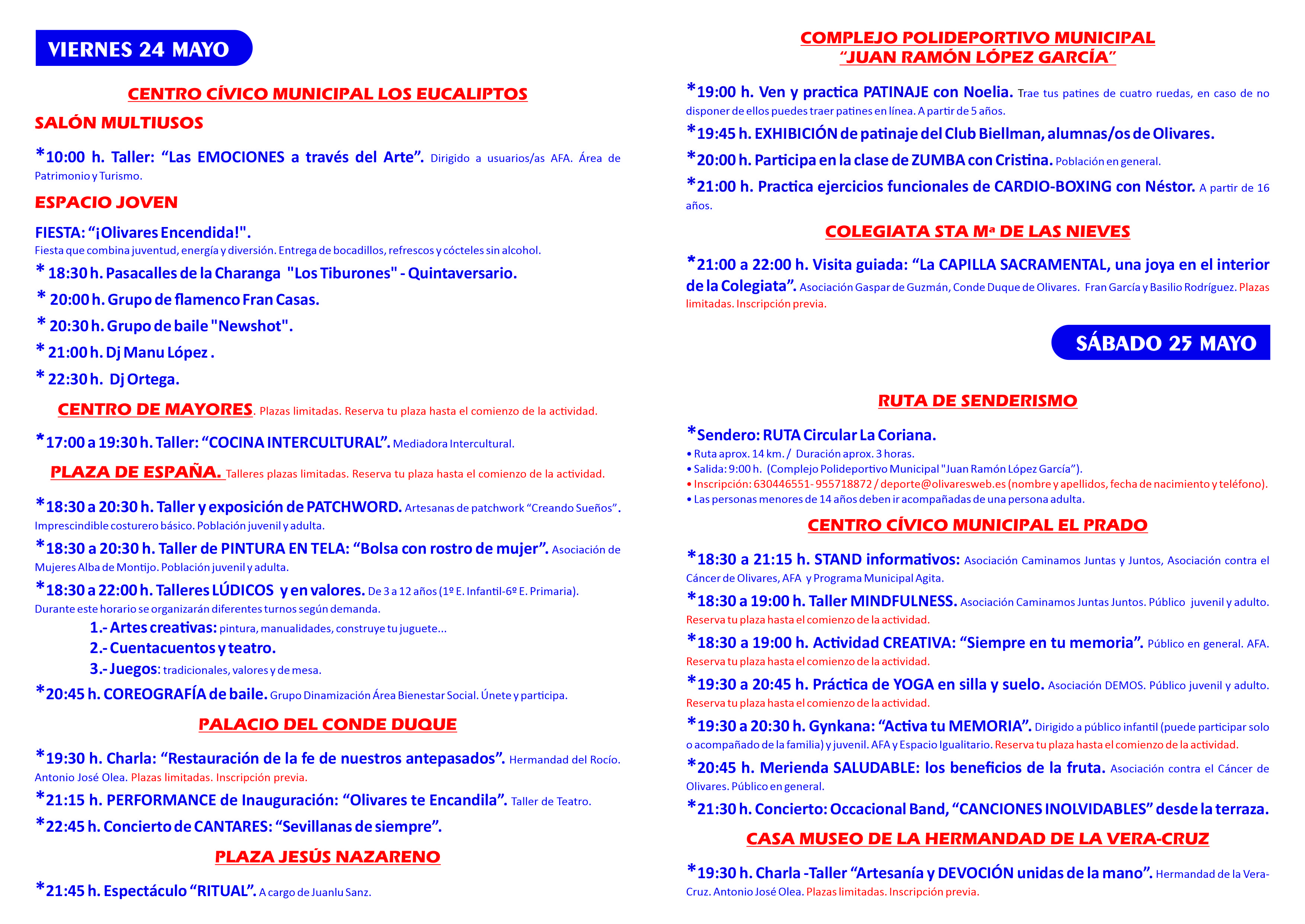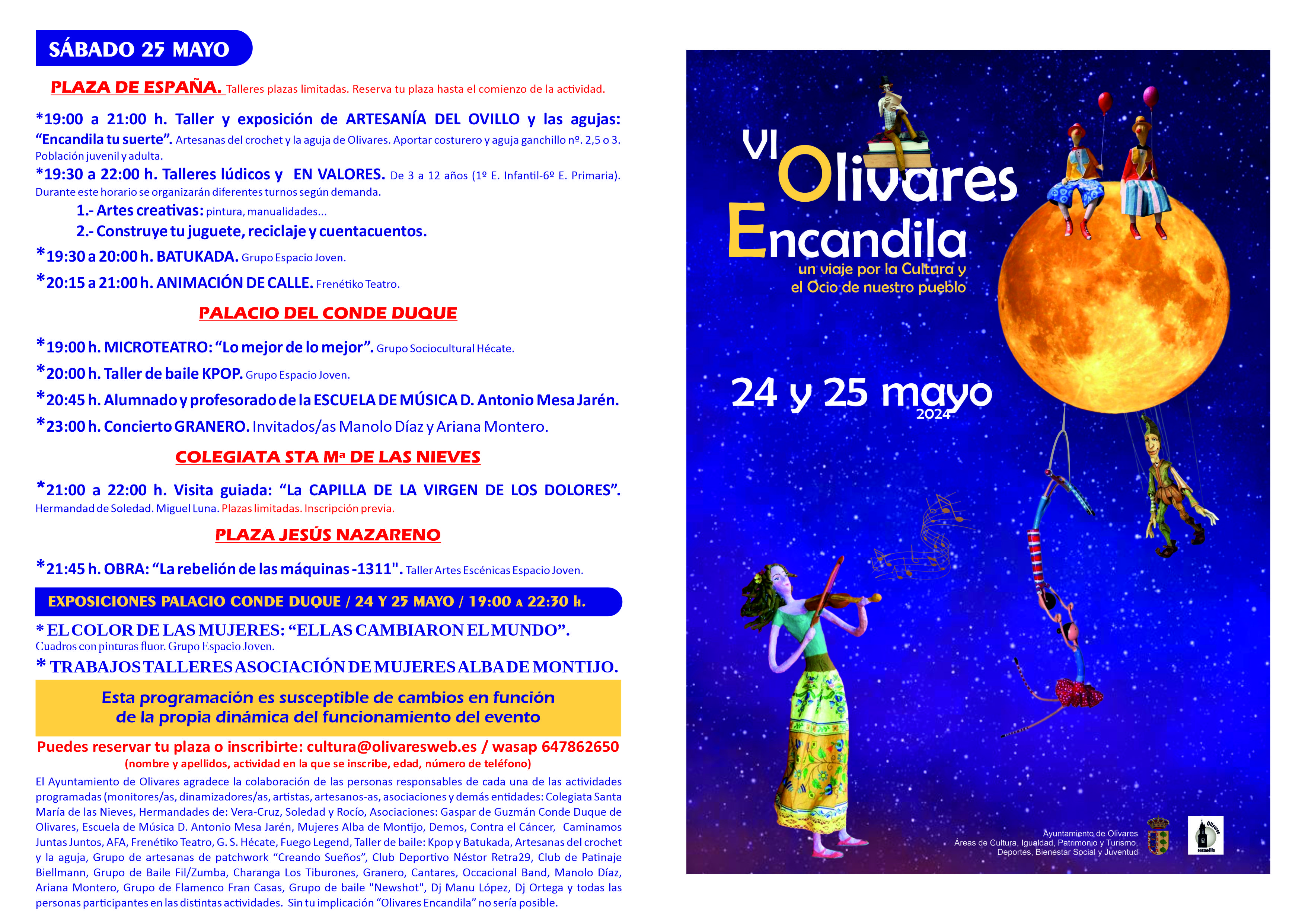 Puedes reservar tu plaza e inscribirte en las actividades a través del correo electrónico cultura@olivaresweb.es y/o el WhatsApp 647 862 650, indicando nombre completo, actividad en la que se inscribe y número de teléfono.