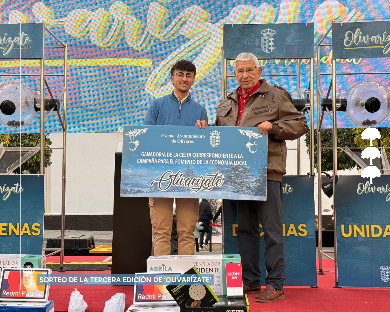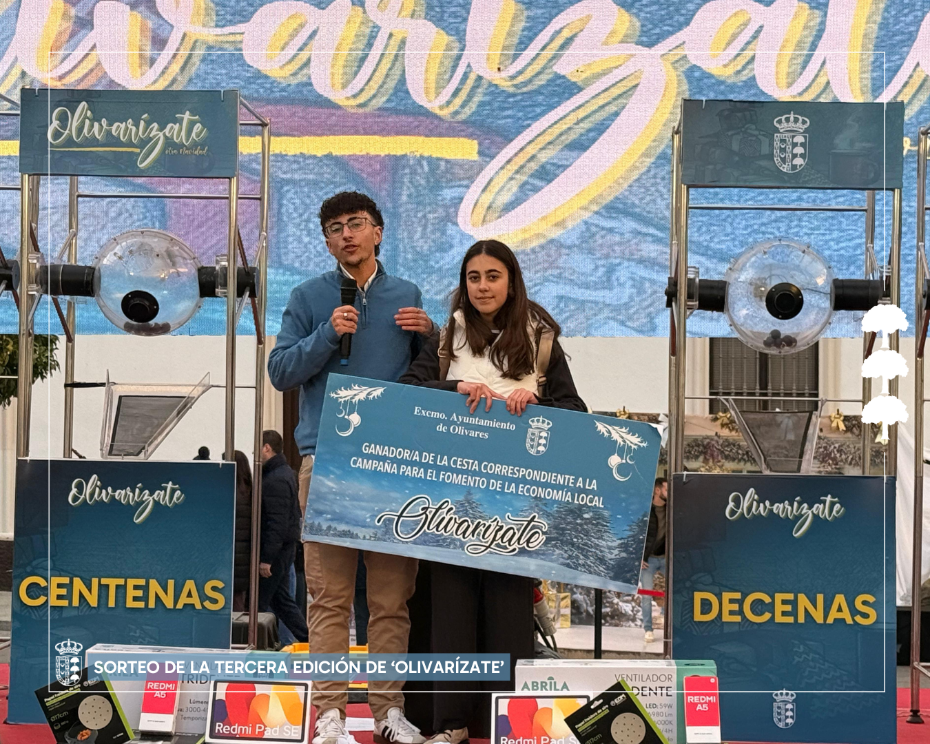 Tras su inicio el pasado 10 de noviembre, la campaña de Navidad y fomento de la economía local ‘Olivarízate’ del Ayuntamiento de Olivares cerró su tercera edición con la celebración en la Plaza de España del gran sorteo de las dos cestas con productos valorados en más de 1.000 euros.